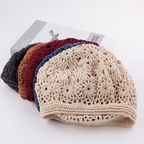 Hochwertige benutzer definierte Logo Damen Blumen gestrickte Häkel mütze für Frühling & Herbst für Strand kleidung & Reisen